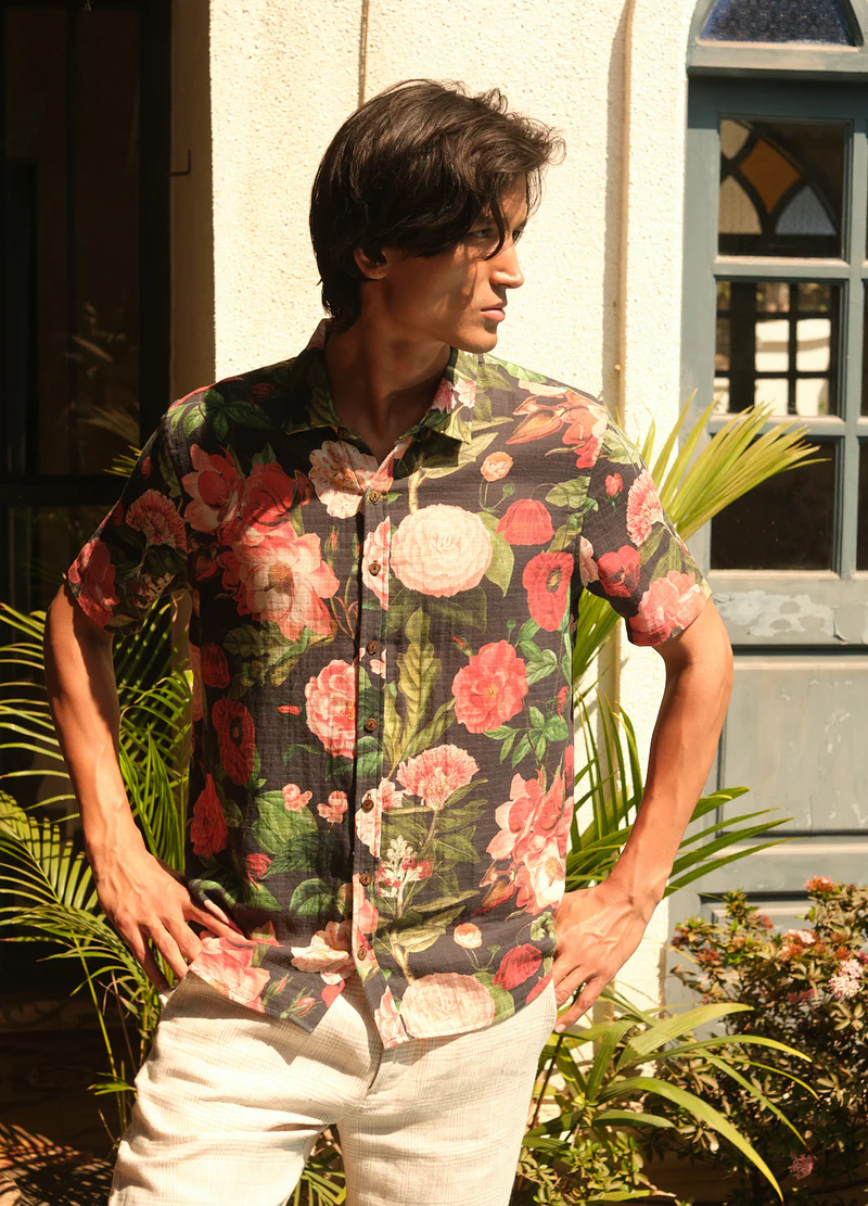 Crafted from a soft, breathable cotton-linen fabric, this shirt features a striking vintage floral print in shades of red, pink, and green on a deep black base — giving you the perfect balance of boldness and sophistication.