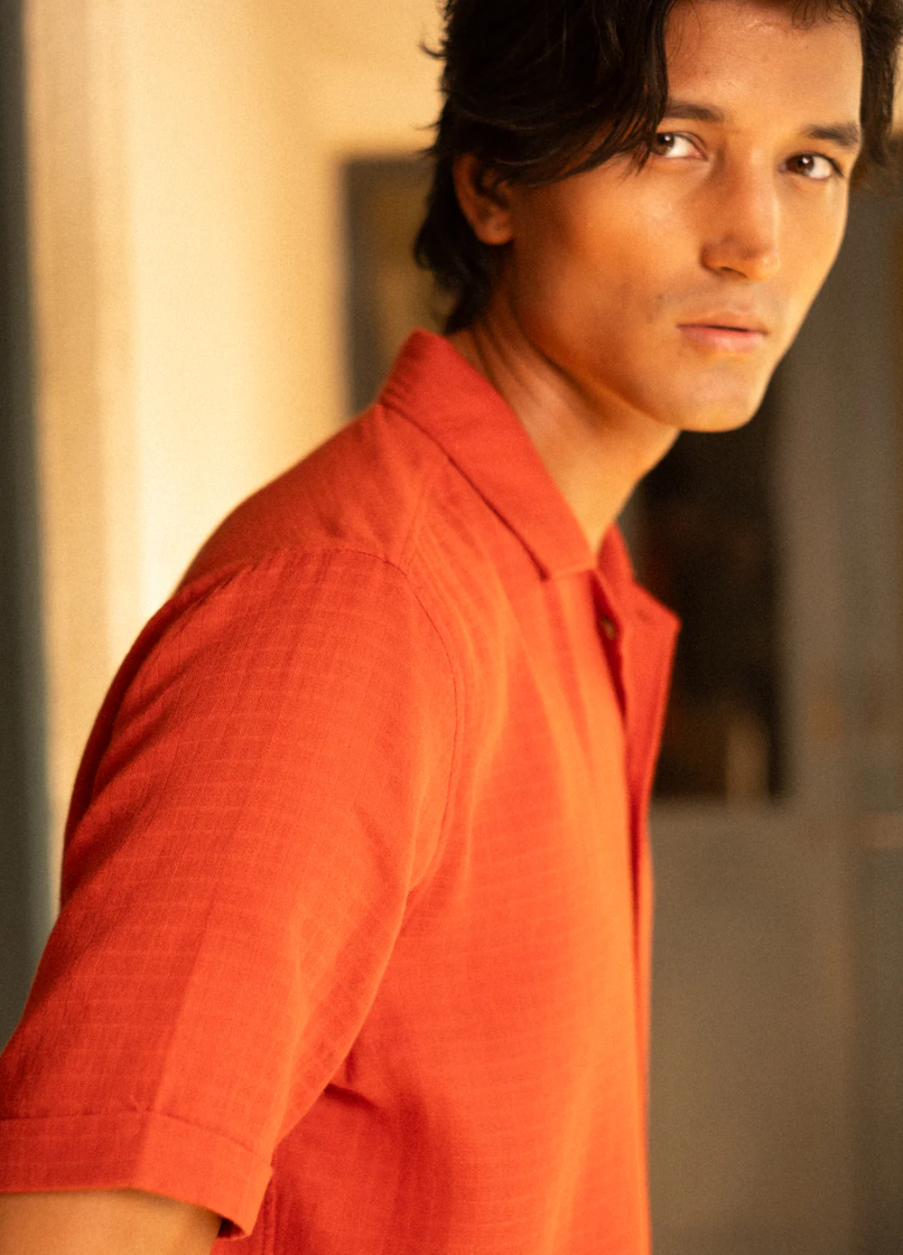 The burnt orange hue captures the warmth of tropical sunsets, making it perfect for daytime ease or evening charm. Featuring a classic Cuban collar, coconut-shell buttons, and a tailored yet comfortable fit, this piece embodies relaxed luxury with a modern edge.